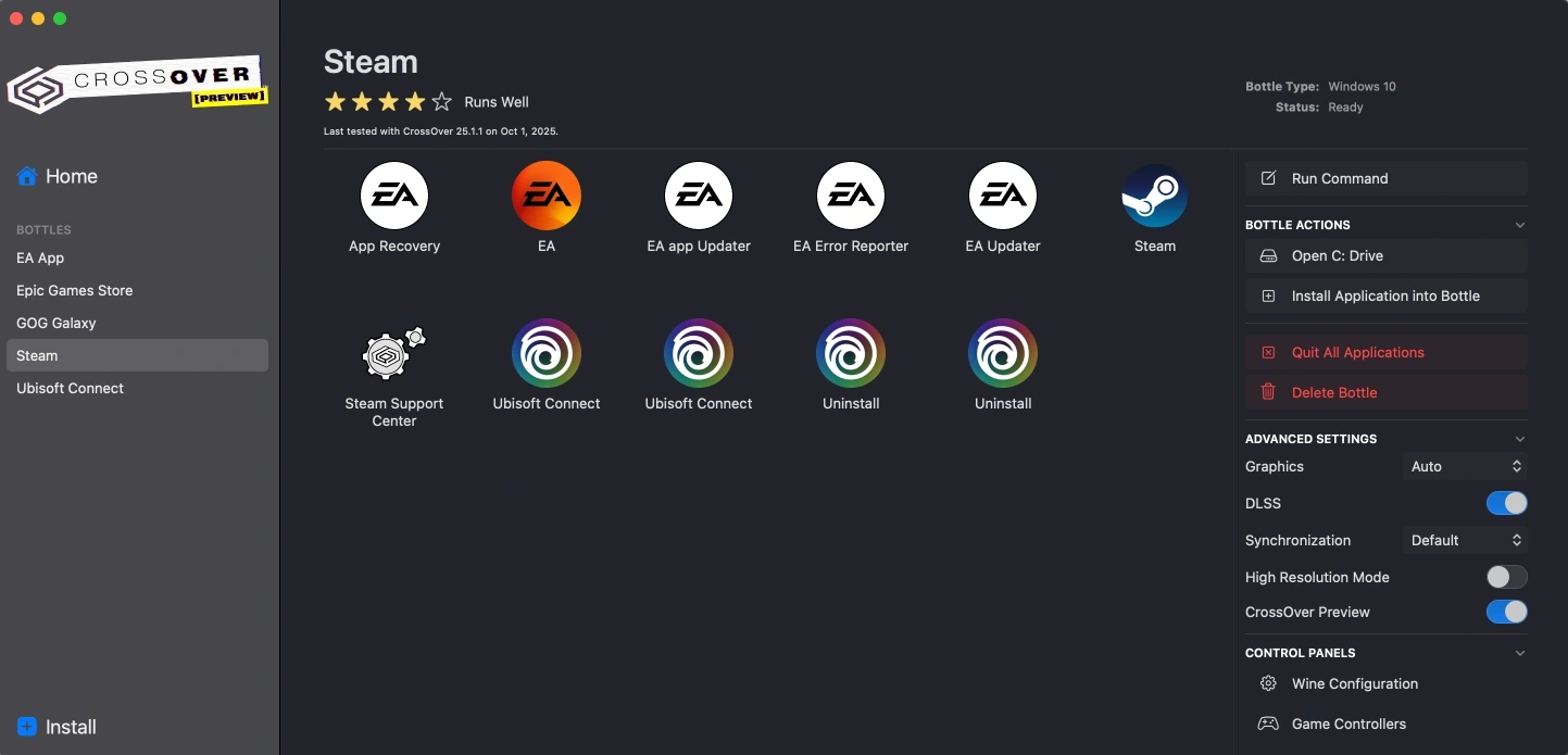 CrossOver is the most popular way to play Windows games on macOS. Through CrossOver, install the Windows version of Steam and other game launchers and then install and play your favorite Windows games.